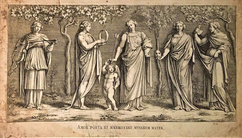 Para ilustrar esta idea de trascendencia, podemos evocar una representación clásica del Renacimiento: el fresco (y su posterior grabado) titulado Amor Poeta Et Mnemosyne Musarum Mater (Cupido y las Musas), atribuido originalmente a Rafael Sanzio en la Logia de la Villa Farnesina (Roma, circa 1517-1518). En esta escena mitológica, Mnemósine —la titánide griega de la memoria y madre de las nueve Musas— aparece en el centro, entregando una flecha a Cupido, mientras cuatro de sus hijas (Musas de la música, la danza, la comedia y la poesía amorosa) la rodean en un paisaje sereno.